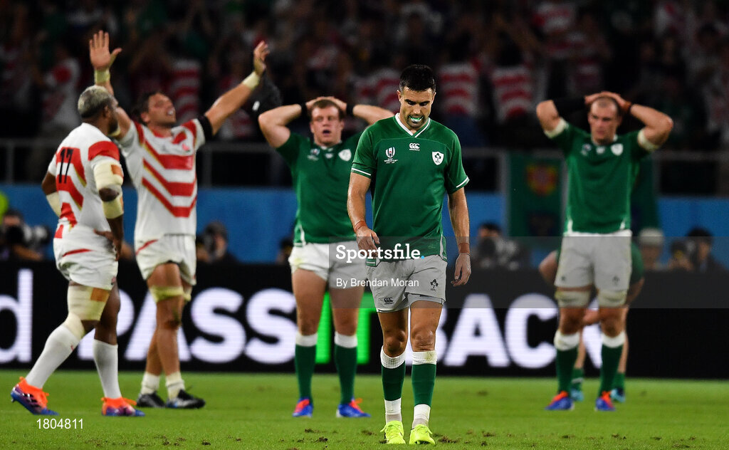 28 September 2019; Conor Murray of Ireland looks on as Japan celebrate victory the 2019 Rugby World Cup Pool A match between Japan and Ireland at the Shizuoka Stadium Ecopa in Fukuroi, Shizuoka Prefecture, Japan. Photo by Brendan Moran/Sportsfile