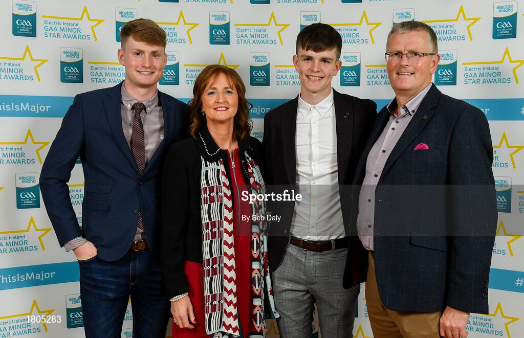 28 September 2019; Cian Galvin of Clarecastle and Clare, with family members Niall, Sheila and John Galvin, on their arrival at the 2019 Electric Ireland Minor Star Awards. The Hurling and Football Team of the Year was selected by an expert panel of GAA legends including Alan Kerins, Derek McGrath, Karl Lacey and Tomás Quinn. The Electric Ireland GAA Minor Star Awards create a major moment for Minor players, showcasing the outstanding achievements of individual performers throughout the Championship season. The awards also recognise the effort of those who support them day in and day out, from their coaches to parents, clubs and communities. #GAAThisIsMajor Photo by Seb Daly/Sportsfile