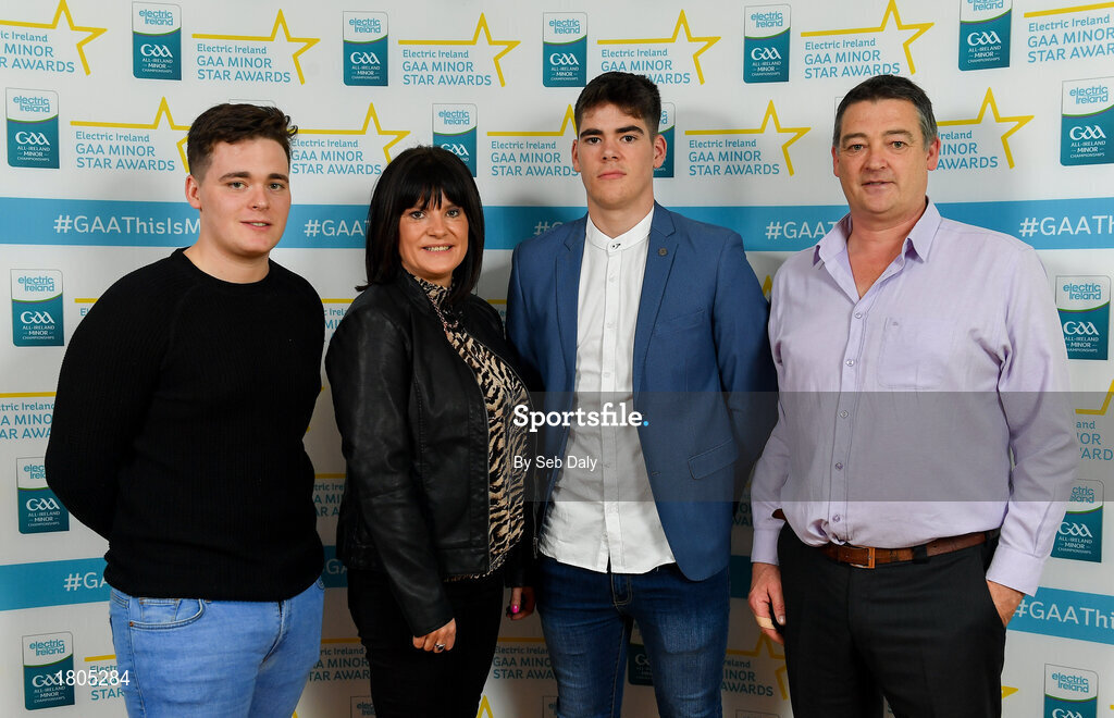 28 September 2019; Ethan Henry of Mayo Gaels and Mayo with Callum, Jackie and Martin Henry on their arrival at the 2019 Electric Ireland Minor Star Awards. The Hurling and Football Team of the Year was selected by an expert panel of GAA legends including Alan Kerins, Derek McGrath, Karl Lacey and Tomás Quinn. The Electric Ireland GAA Minor Star Awards create a major moment for Minor players, showcasing the outstanding achievements of individual performers throughout the Championship season. The awards also recognise the effort of those who support them day in and day out, from their coaches to parents, clubs and communities. #GAAThisIsMajor Photo by Seb Daly/Sportsfile