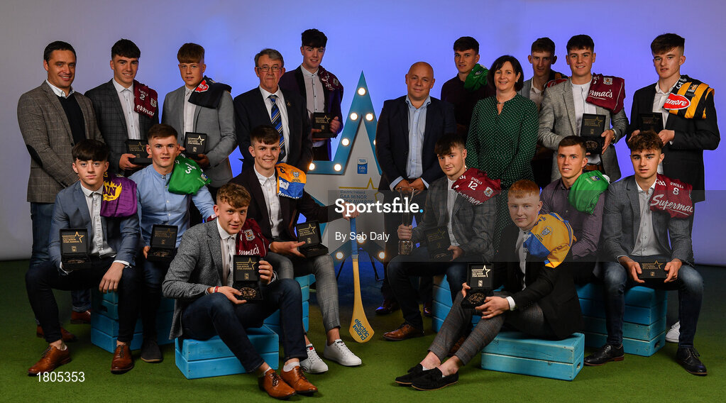 28 September 2019; The Electric Ireland Minor Hurling Team of the Year, back row, from left, Christy Brennan of Clarinbridge and Galway, Aidan Tallis of Lisdowney and Kilkenny, Greg Thomas of Ballygar and Galway, Cathal O'Neill of Crecora-Manister and Limerick, Peter McDonald of Thomastown and Kilkenny, Eoin Lawless of St. Mary's, Athenry and Galway, and Billy Drennan of Galmoy and Kilkenny, front row, from left, AJ Redmond of Rathnure and Wexford, Ronan Lyons of Monaleen and Limerick, Ian McGlynn of Kilconieron and Galway, Cian Galvin of Clarecastle and Clare, Seán McDonagh of Mountbellew Moylough and Galway, Shane Meehan of The Banner and Clare, Patrick Kirby of Patrickswell and Limerick, and Alex Connaire of Sarsfields and Galway, are joined by Alan Kerins, Electric Ireland GAA Minor Stars Awards Panel Member, left, Munster Council chairman Liam Lenihan, centre left, and Derek McGrath, Electric Ireland GAA Minor Stars Awards Panel Member, centre right, and Executive Director of ESB Marguerite Sayers, at the 2019 Electric Ireland Minor Star Awards. The Hurling Team of the Year was selected by an expert panel of GAA legends including Alan Kerins, Derek McGrath, Karl Lacey and Tomás Quinn. The Electric Ireland GAA Minor Star Awards create a major moment for Minor players, showcasing the outstanding achievements of individual performers throughout the Championship season. The awards also recognise the effort of those who support them day in and day out, from their coaches to parents, clubs and communities. #GAAThisIsMajor Photo by Seb Daly/Sportsfile