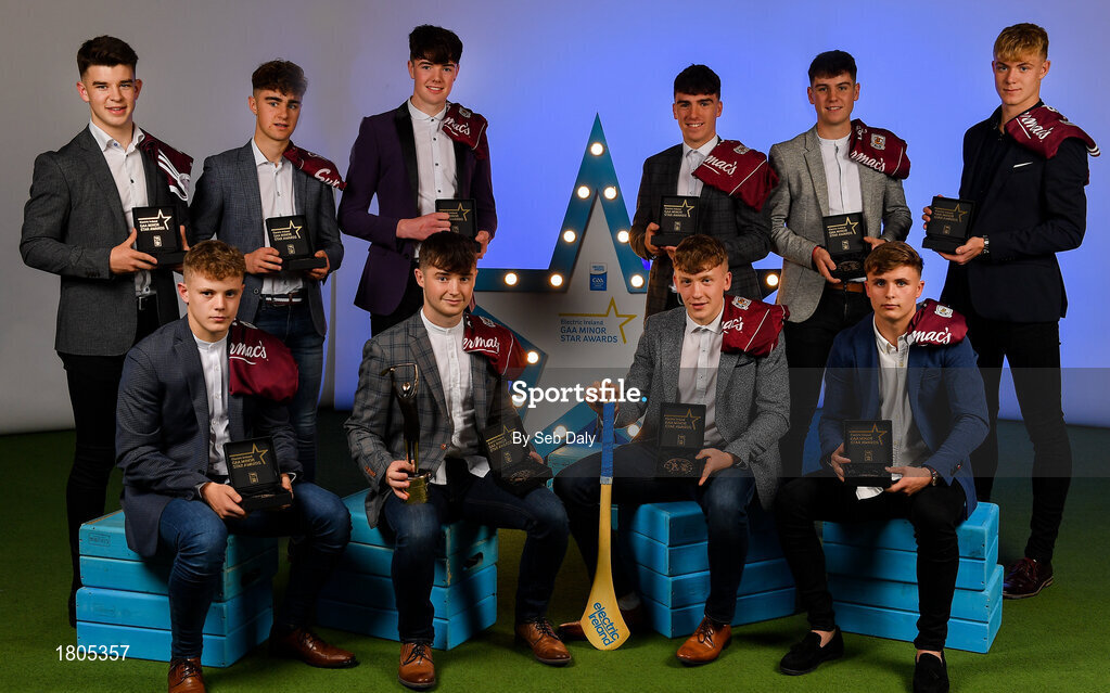 28 September 2019; Pictured are Galway’s Minor footballers and Minor hurlers, back row, from left, Tomo Culhane, Alex Connaire, Greg Thomas, Christy Brennan, Eoin Lawless and James McLaughlin, front row, from left, Jonathan McGrath, Seán McDonagh, Ian McGlynn and Daniel Cox who were named on the Electric Ireland Minor Hurling and Football Teams of the Year at the 2019 Electric Ireland Minor Star Awards. The Hurling/Football Team of the Year was selected by an expert panel of GAA legends including Alan Kerins, Derek McGrath, Karl Lacey and Tomás Quinn. The Electric Ireland GAA Minor Star Awards create a major moment for Minor players, showcasing the outstanding achievements of individual performers throughout the Championship season. The awards also recognise the effort of those who support them day in and day out, from their coaches to parents, clubs and communities. #GAAThisIsMajor Photo by Seb Daly/Sportsfile