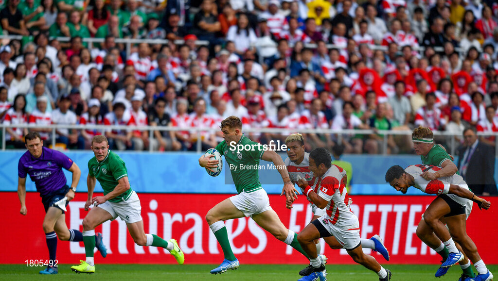 28 September 2019; Garry Ringrose of Ireland makes a break during the 2019 Rugby World Cup Pool A match between Japan and Ireland at the Shizuoka Stadium Ecopa in Fukuroi, Shizuoka Prefecture, Japan. Photo by Brendan Moran/Sportsfile