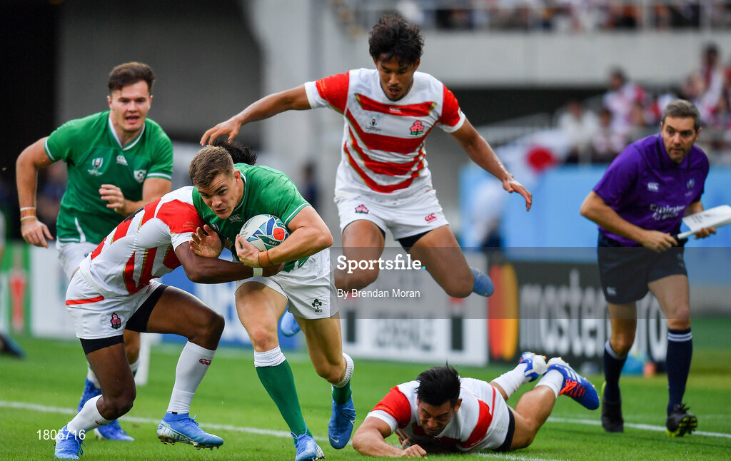 28 September 2019; Garry Ringrose of Ireland is tackled by Kotaro Matsushima of Japan during the 2019 Rugby World Cup Pool A match between Japan and Ireland at the Shizuoka Stadium Ecopa in Fukuroi, Shizuoka Prefecture, Japan. Photo by Brendan Moran/Sportsfile