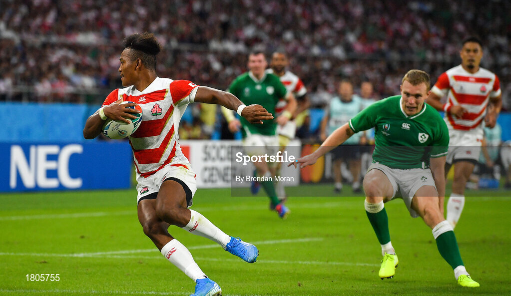 28 September 2019; Kotaro Matsushima of Japan in action against Keith Earls of Ireland during the 2019 Rugby World Cup Pool A match between Japan and Ireland at the Shizuoka Stadium Ecopa in Fukuroi, Shizuoka Prefecture, Japan. Photo by Brendan Moran/Sportsfile