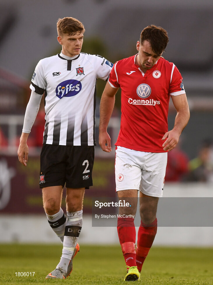 29 September 2019; A dejected John Mahon of Sligo Rovers is consoled by Seán Gannon of Dundalk following the Extra.ie FAI Cup Semi-Final match between Sligo Rovers and Dundalk at The Showgrounds in Sligo. Photo by Stephen McCarthy/Sportsfile