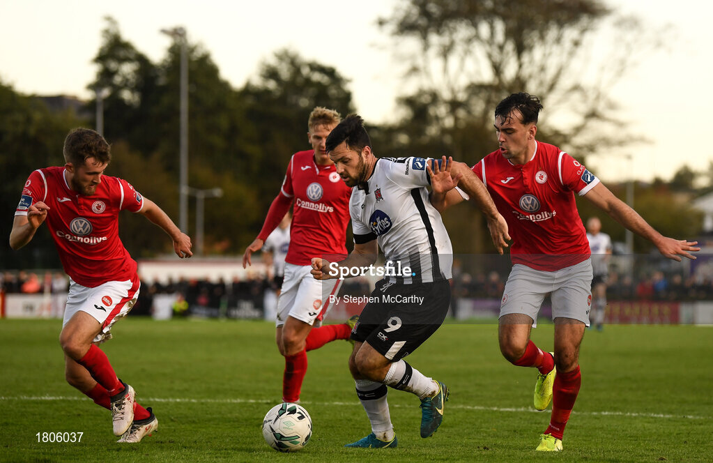 29 September 2019; Patrick Hoban of Dundalk in action against Sligo Rovers players, from left, Lewis Banks, Kris Twardek and John Mahon during the Extra.ie FAI Cup Semi-Final match between Sligo Rovers and Dundalk at The Showgrounds in Sligo. Photo by Stephen McCarthy/Sportsfile