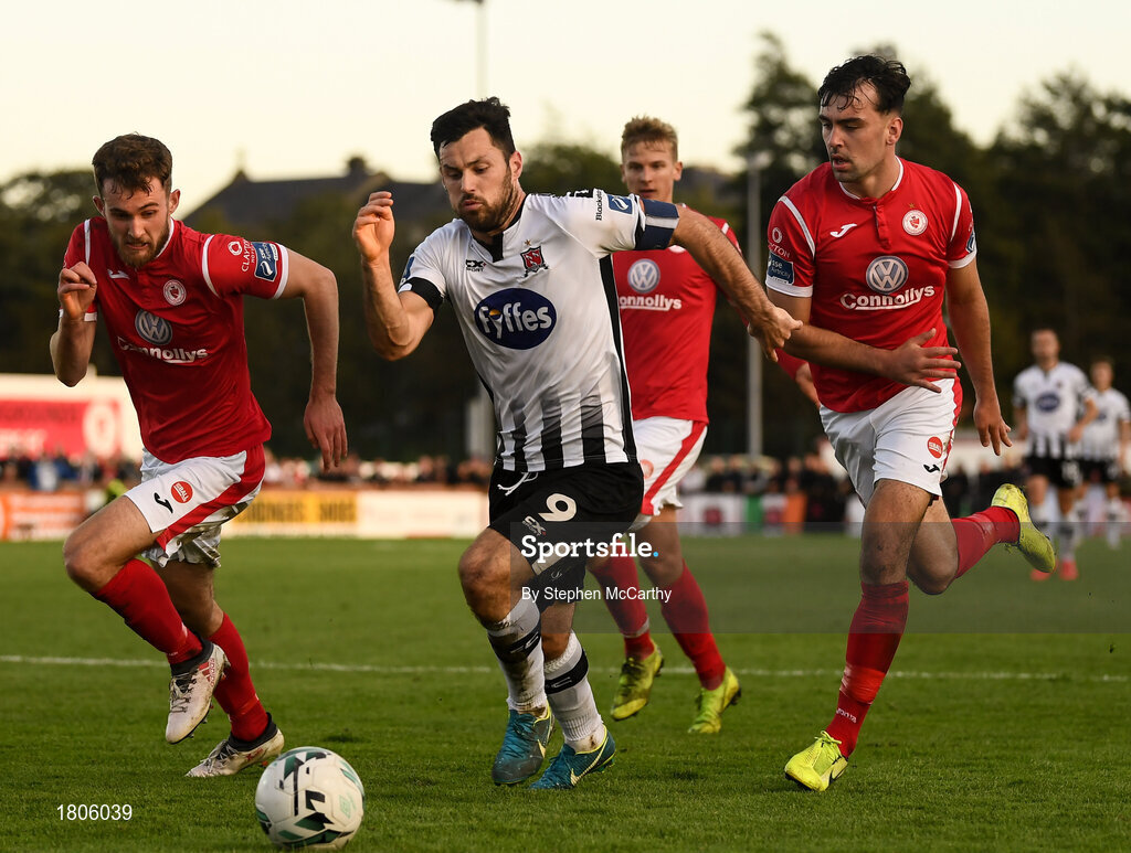 29 September 2019; Patrick Hoban of Dundalk in action against Sligo Rovers players, from left, Lewis Banks, Kris Twardek and John Mahon during the Extra.ie FAI Cup Semi-Final match between Sligo Rovers and Dundalk at The Showgrounds in Sligo. Photo by Stephen McCarthy/Sportsfile