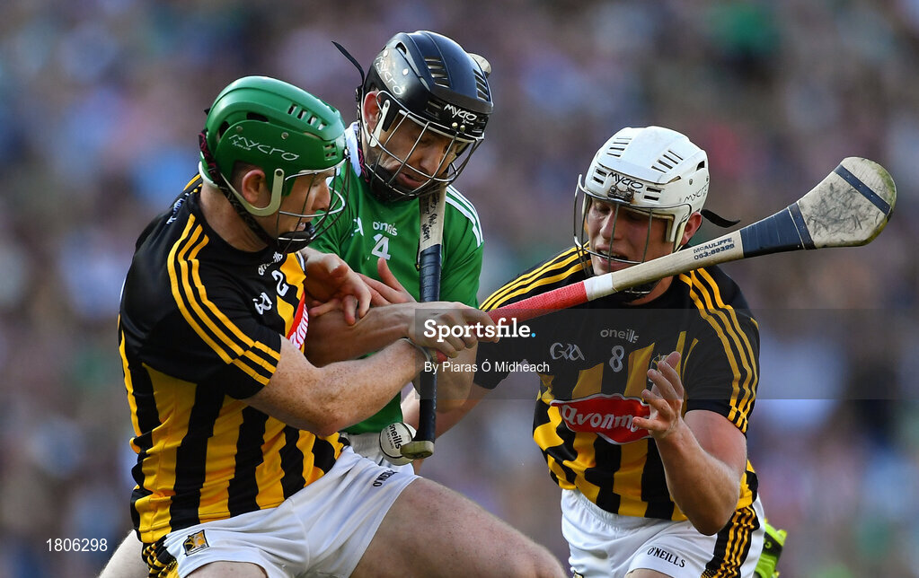 27 July 2019; Graeme Mulcahy of Limerick is tackled by Paul Murphy, left, and Conor Browne of Kilkenny during the GAA Hurling All-Ireland Senior Championship Semi-Final match between Kilkenny and Limerick at Croke Park in Dublin. Photo by Piaras Ó Mídheach/Sportsfile