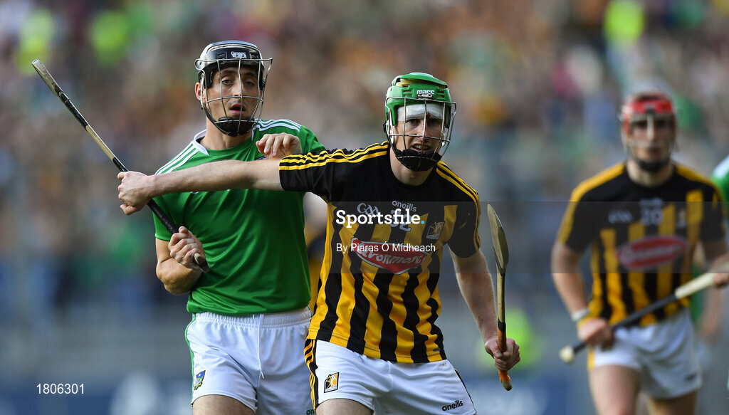 27 July 2019; Joey Holden of Kilkenny and Pat Ryan of Limerick await a sideline cut during the GAA Hurling All-Ireland Senior Championship Semi-Final match between Kilkenny and Limerick at Croke Park in Dublin. Photo by Piaras Ó Mídheach/Sportsfile