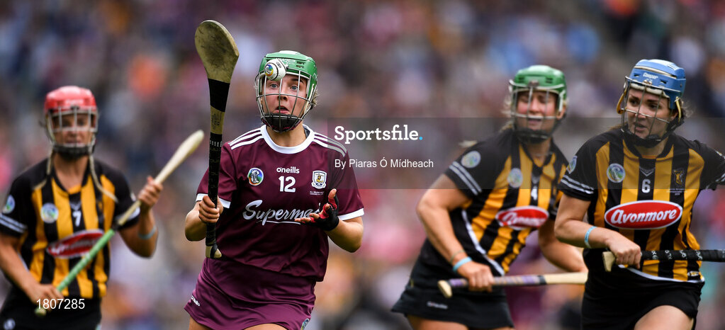 8 September 2019; Sarah Spellman of Galway in action against Kilkenny players Grace Walsh, Edwina Keane, and Claire Phelan during the Liberty Insurance All-Ireland Senior Camogie Championship Final match between Galway and Kilkenny at Croke Park in Dublin. Photo by Piaras Ó Mídheach/Sportsfile