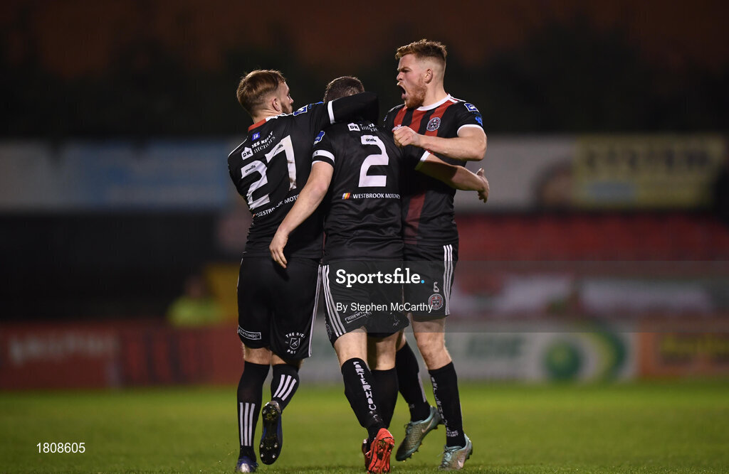 4 October 2019; Derek Pender, 2, celebrates with his Bohemians team-mates Luke Wade-Slater, left, and Scott Allardice, right, after scoring his side's goal during the SSE Airtricity League Premier Division match between Bohemians and Cork City at Dalymount Park in Dublin. Photo by Stephen McCarthy/Sportsfile
