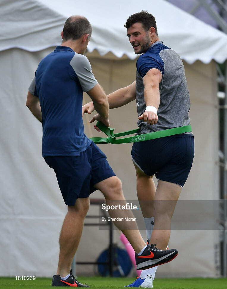 7 October 2019; Robbie Henshaw with team physio Dr. Phil Glasgow during Ireland Rugby squad training session at Shirouzuoike Park in Fukuoka, Japan. Photo by Brendan Moran/Sportsfile