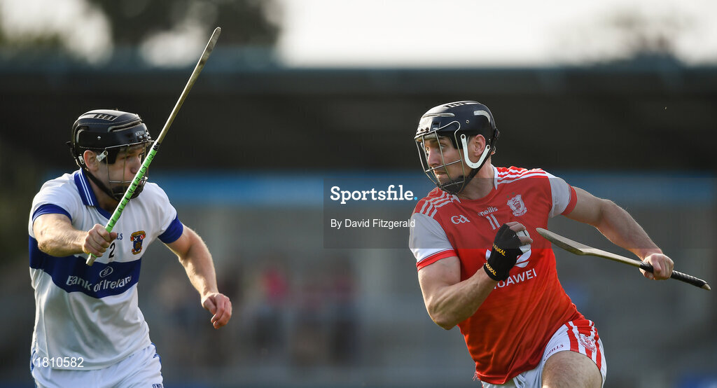 6 October 2019; Mark Schutte of Cuala in action against Rory Pocock of St Vincents during the Dublin County Senior Club Hurling Championship semi-final match between St Vincents and Cuala at Parnell Park in Dublin. Photo by David Fitzgerald/Sportsfile