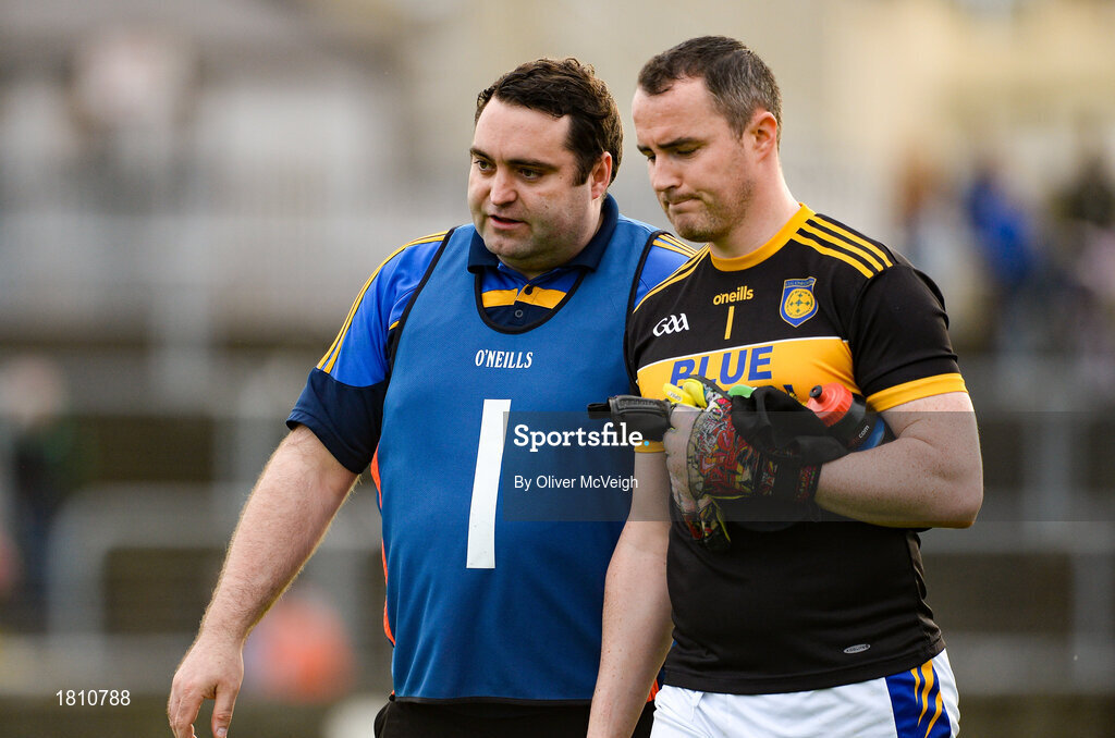 6 October 2019; Kilcar manager Barry Doherty comes of the pitch with Kilcar goalkeeper Eamonn McGinley the Donegal County Senior Club Football Championship semi-final match between Kilcar and Gaoth Dobhair at MacCumhaill Park in Ballybofey, Donegal. Photo by Oliver McVeigh/Sportsfile