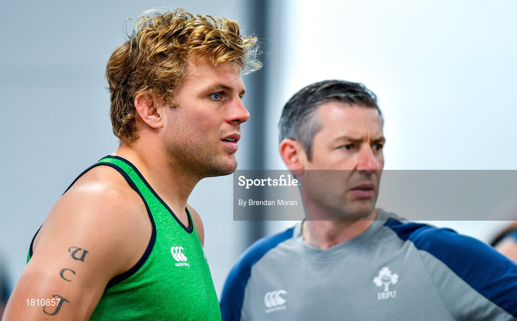 8 October 2019; Jordi Murphy with team physio Keith Fox during an Ireland Rugby squad gym session at Shirouzuoike Park in Fukuoka, Japan. Photo by Brendan Moran/Sportsfile