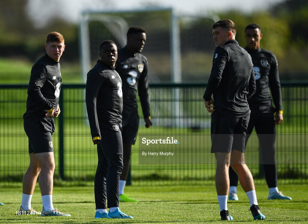 8 October 2019; Republic of Ireland players, from left, Kameron Ledwidge, Michael Obafemi and Dara O'Shea during a Republic of Ireland U21's Training Session at FAI National Training Centre in Abbotstown, Dublin. Photo by Harry Murphy/Sportsfile