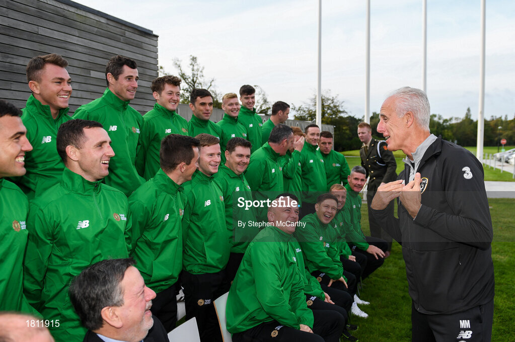9 October 2019; Republic of Ireland manager Mick McCarthy, pictured, was on hand to wish the Irish Defence Forces team a bon voyage at Abbotstown as they prepare to travel to China for the World Military Games. McCarthy joined Minister of State for Defence Paul Kehoe, FAI President Donal Conway, Brigadier General Peter O’Halloran and boxing coach Phil Sutcliffe at FAI Headquarters. The Irish Defence Forces football team, backed by the FAI, knocked Germany and Holland out of the qualifiers en route to the tournament and will be joined in Wuhon city by boxers and a shooting team. Photo by Stephen McCarthy/Sportsfile