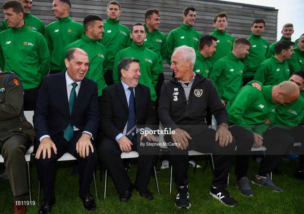 9 October 2019; Republic of Ireland manager Mick McCarthy was on hand to wish the Irish Defence Forces team a bon voyage at Abbotstown as they prepare to travel to China for the World Military Games. McCarthy joined Minister of State for Defence Paul Kehoe, FAI President Donal Conway, Brigadier General Peter O’Halloran and boxing coach Phil Sutcliffe at FAI Headquarters. The Irish Defence Forces football team, backed by the FAI, knocked Germany and Holland out of the qualifiers en route to the tournament and will be joined in Wuhon city by boxers and a shooting team. Pictured are, from left, Minister of State for Defence Paul Kehoe, FAI President Donal Conway and Republic of Ireland manager Mick McCarthy. Photo by Stephen McCarthy/Sportsfile