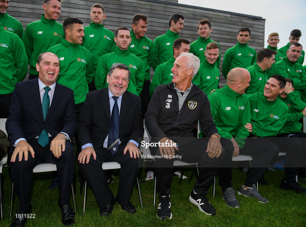 9 October 2019; Republic of Ireland manager Mick McCarthy was on hand to wish the Irish Defence Forces team a bon voyage at Abbotstown as they prepare to travel to China for the World Military Games. McCarthy joined Minister of State for Defence Paul Kehoe, FAI President Donal Conway, Brigadier General Peter O’Halloran and boxing coach Phil Sutcliffe at FAI Headquarters. The Irish Defence Forces football team, backed by the FAI, knocked Germany and Holland out of the qualifiers en route to the tournament and will be joined in Wuhon city by boxers and a shooting team. Pictured are, from left, Minister of State for Defence Paul Kehoe, FAI President Donal Conway and Republic of Ireland manager Mick McCarthy. Photo by Stephen McCarthy/Sportsfile