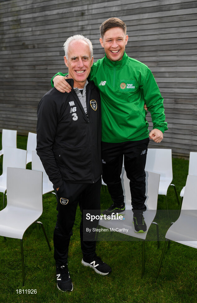 9 October 2019; Republic of Ireland manager Mick McCarthy was on hand to wish the Irish Defence Forces team a bon voyage at Abbotstown as they prepare to travel to China for the World Military Games. McCarthy joined Minister of State for Defence Paul Kehoe, FAI President Donal Conway, Brigadier General Peter O’Halloran and boxing coach Phil Sutcliffe at FAI Headquarters. The Irish Defence Forces football team, backed by the FAI, knocked Germany and Holland out of the qualifiers en route to the tournament and will be joined in Wuhon city by boxers and a shooting team. Pictured is Republic of Ireland manager Mick McCarthy with Del Walsh, a member of the Irish Defence Forces football team. Photo by Stephen McCarthy/Sportsfile