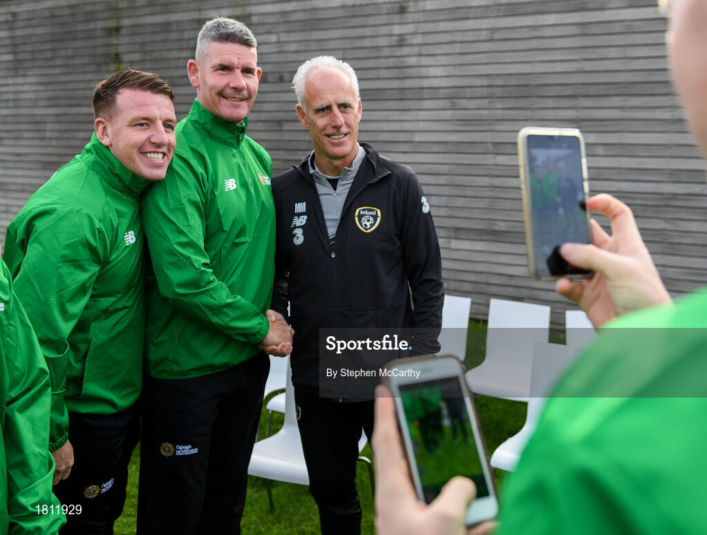 9 October 2019; Republic of Ireland manager Mick McCarthy was on hand to wish the Irish Defence Forces team a bon voyage at Abbotstown as they prepare to travel to China for the World Military Games. McCarthy joined Minister of State for Defence Paul Kehoe, FAI President Donal Conway, Brigadier General Peter O’Halloran and boxing coach Phil Sutcliffe at FAI Headquarters. The Irish Defence Forces football team, backed by the FAI, knocked Germany and Holland out of the qualifiers en route to the tournament and will be joined in Wuhon city by boxers and a shooting team. Pictured is Republic of Ireland manager Mick McCarthy with members of the Irish Defence Forces football team Scott Delaney and Anthony Jinks. Photo by Stephen McCarthy/Sportsfile