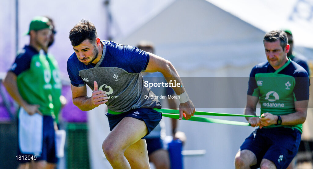 10 October 2019; Robbie Henshaw with team physio Keith Fox during Ireland Rugby squad training at Shirouzuoike Park in Fukuoka, Japan. Photo by Brendan Moran/Sportsfile