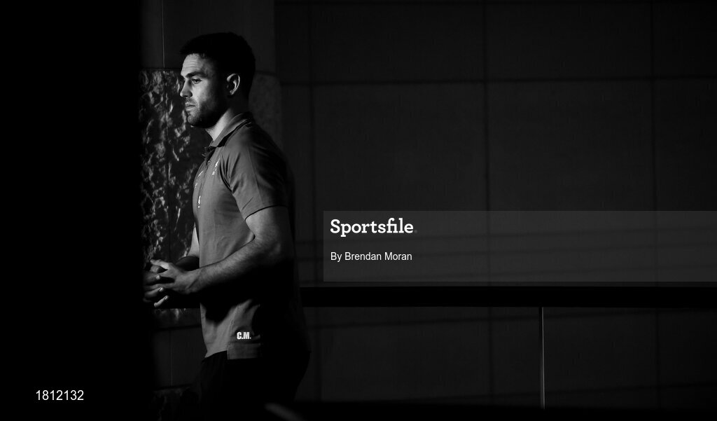 10 October 2019; (EDITOR'S NOTE: Image has been converted to black & white) Conor Murray is interviewed during an Ireland Rugby press conference at the Grand Hyatt in Fukuoka, Japan. Photo by Brendan Moran/Sportsfile