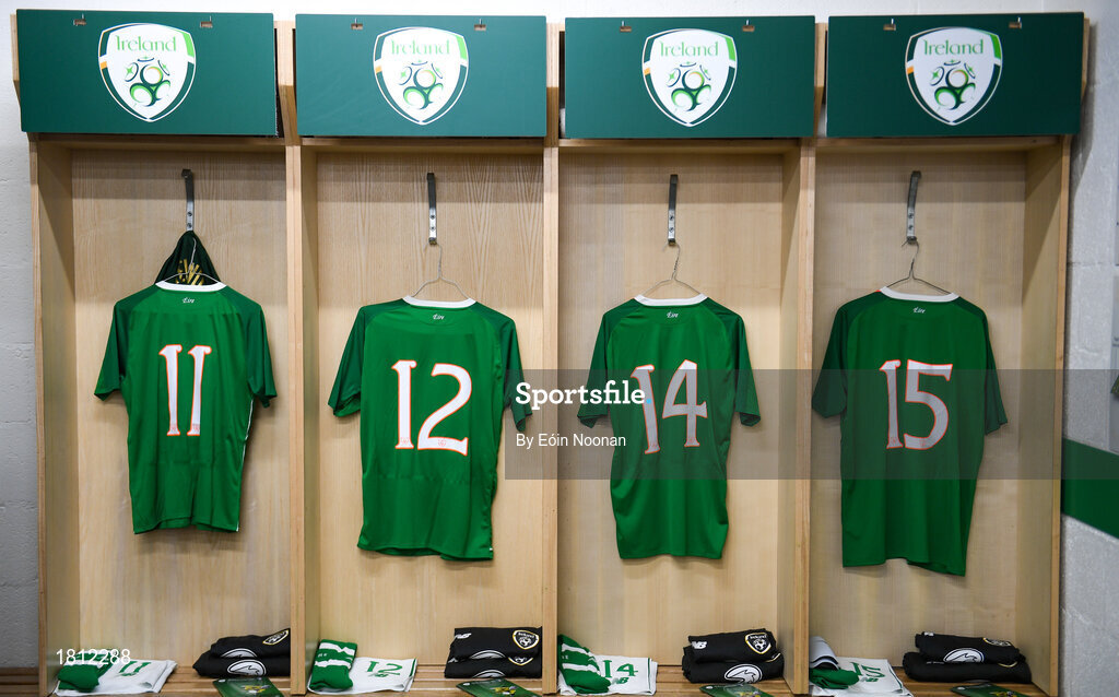 10 October 2019; A general view of Ireland jerseys hanging in the dressing room prior to the UEFA European U21 Championship Qualifier Group 1 match between Republic of Ireland and Italy at Tallaght Stadium in Tallaght, Dublin. Photo by Eóin Noonan/Sportsfile