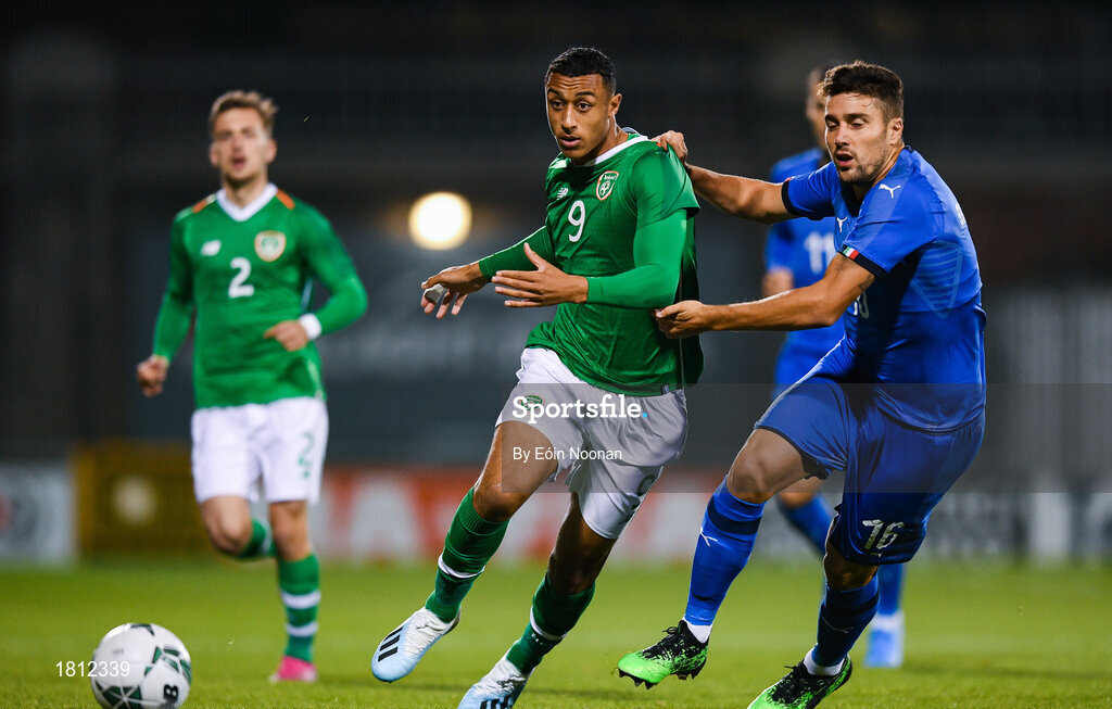 10 October 2019; Adam Idah of Republic of Ireland in action against Riccardo Marchizza of Italy during the UEFA European U21 Championship Qualifier Group 1 match between Republic of Ireland and Italy at Tallaght Stadium in Tallaght, Dublin. Photo by Eóin Noonan/Sportsfile