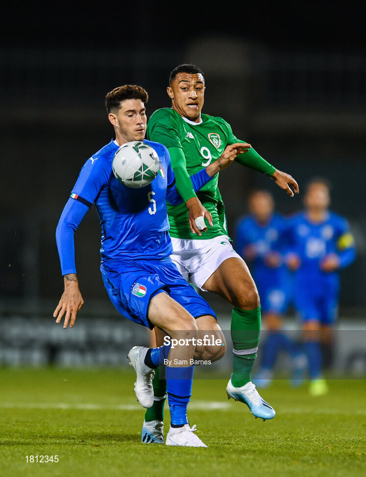 10 October 2019; Alessandro Bastoni of Italy in action against Adam Idah of Republic of Ireland during the UEFA European U21 Championship Qualifier Group 1 match between Republic of Ireland and Italy at Tallaght Stadium in Tallaght, Dublin. Photo by Sam Barnes/Sportsfile