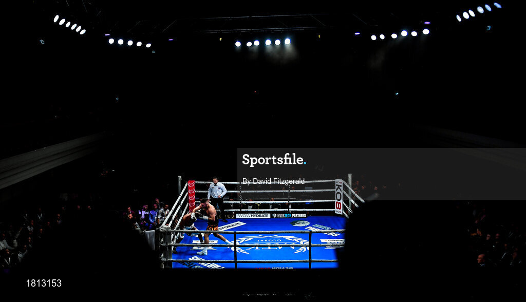 11 October 2019; Conrad Cummings, right, in action against Adam Grabiec during their middleweight bout at the MTK Fight Night in the Ulster Hall, Belfast. Photo by David Fitzgerald/Sportsfile