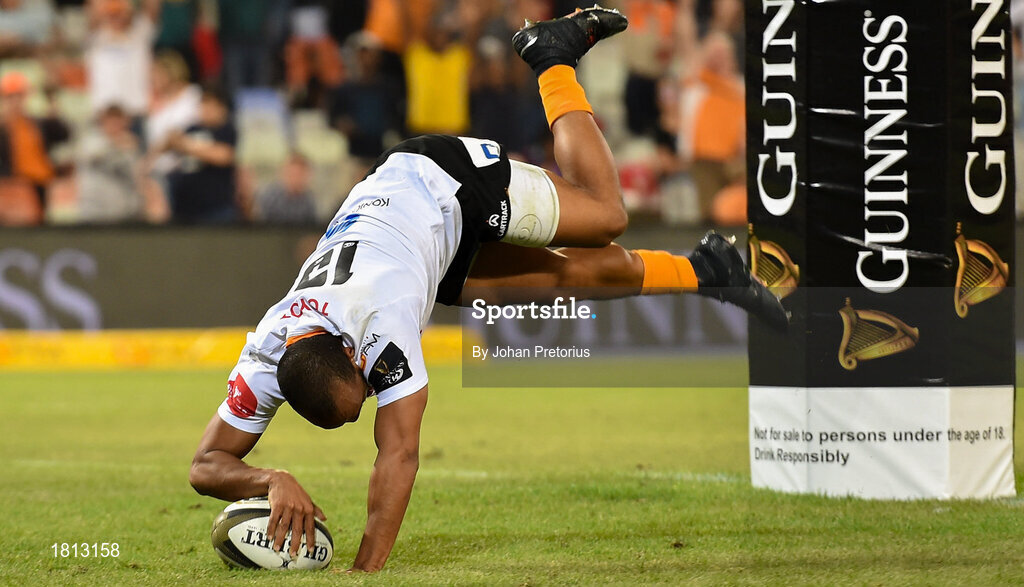 11 October 2019; Rhyno Smith of Toyota Cheetahs scores a try for his side during the Guinness PRO14 Round 3 match between Toyota Cheetahs and Munster at Toyota Stadium in Bloemfontein, South Africa. Photo by Johan Pretorius/Sportsfile