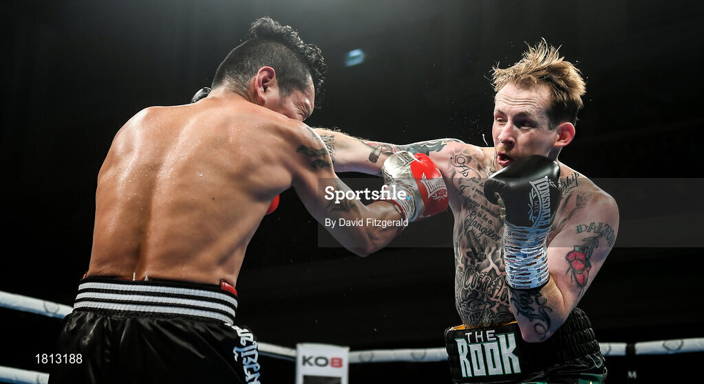 11 October 2019; Ruairi Dalton, right, in action against Jose Hernandez during their super-featherweight bout at the MTK Fight Night in the Ulster Hall, Belfast. Photo by David Fitzgerald/Sportsfile