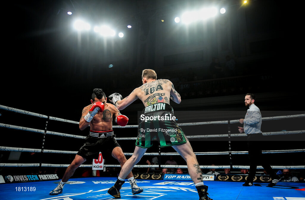 11 October 2019; Ruairi Dalton, right, in action against Jose Hernandez during their super-featherweight bout at the MTK Fight Night in the Ulster Hall, Belfast. Photo by David Fitzgerald/Sportsfile
