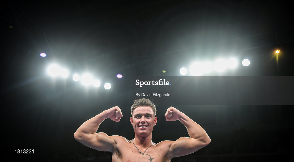 11 October 2019; Paddy Donovan celebrates following his welterweight bout against Arturo Lopez at the MTK Fight Night in the Ulster Hall, Belfast. Photo by David Fitzgerald/Sportsfile