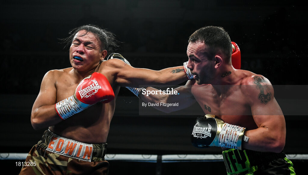 11 October 2019; Edwin Tellez, left, in action against Seanie Duffy during their lightweight bout at the MTK Fight Night in the Ulster Hall, Belfast. Photo by David Fitzgerald/Sportsfile
