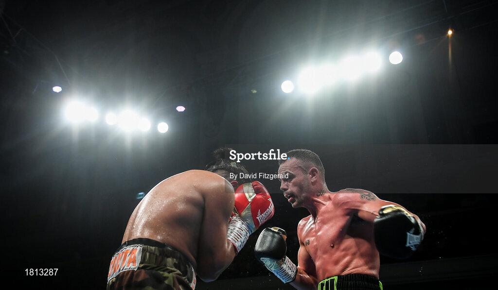 11 October 2019; Seanie Duffy, right, in action against Edwin Tellez during their lightweight bout at the MTK Fight Night in the Ulster Hall, Belfast. Photo by David Fitzgerald/Sportsfile