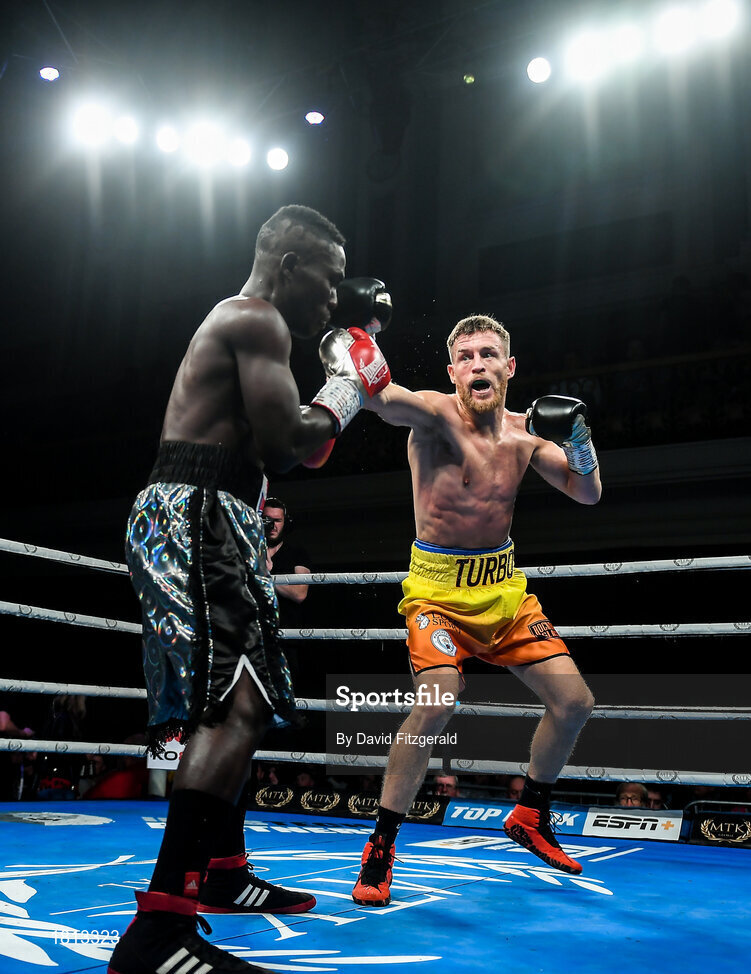 11 October 2019; Terry Flanagan, right, in action against Michael Ansah during their lightweight bout at the MTK Fight Night in the Ulster Hall, Belfast. Photo by David Fitzgerald/Sportsfile