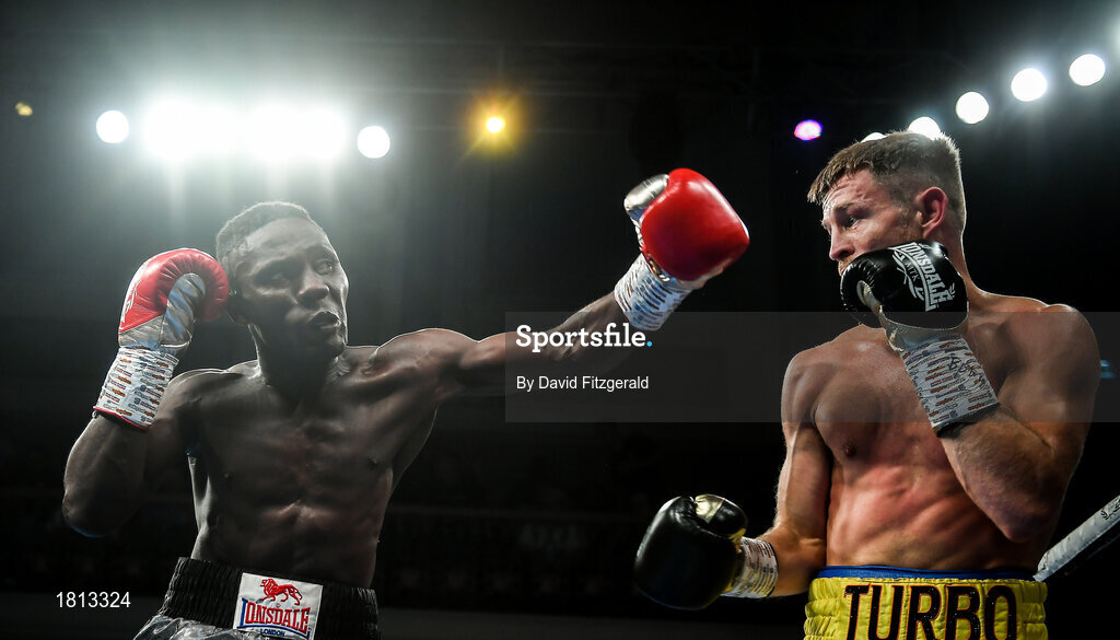 11 October 2019; Terry Flanagan, right, in action against Michael Ansah during their lightweight bout at the MTK Fight Night in the Ulster Hall, Belfast. Photo by David Fitzgerald/Sportsfile