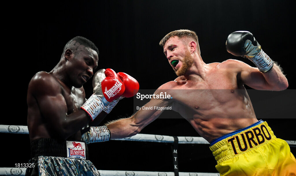 11 October 2019; Terry Flanagan, right, in action against Michael Ansah during their lightweight bout at the MTK Fight Night in the Ulster Hall, Belfast. Photo by David Fitzgerald/Sportsfile