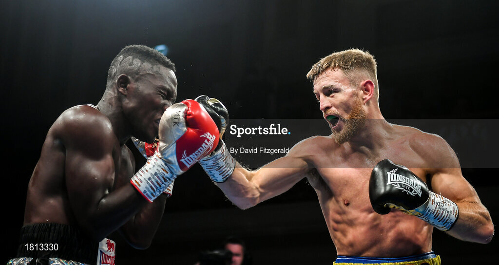 11 October 2019; Terry Flanagan, right, in action against Michael Ansah during their lightweight bout at the MTK Fight Night in the Ulster Hall, Belfast. Photo by David Fitzgerald/Sportsfile