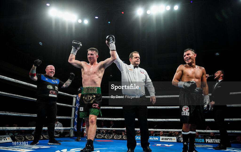 11 October 2019; Pierce O'Leary is declared victorious following his super lightweight bout against Oscar Amador at the MTK Fight Night in the Ulster Hall, Belfast. Photo by David Fitzgerald/Sportsfile
