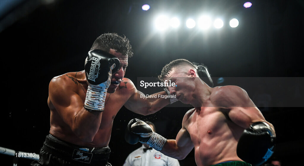 11 October 2019; Pierce O'Leary, right, in action against Oscar Amador during their super lightweight bout at the MTK Fight Night in the Ulster Hall, Belfast. Photo by David Fitzgerald/Sportsfile