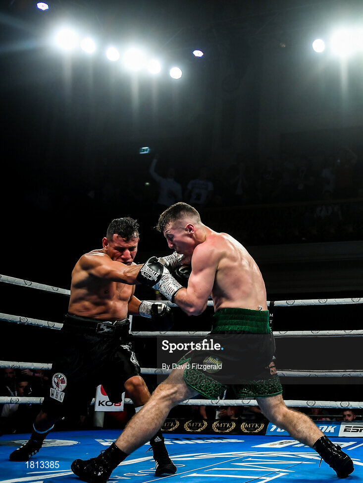 11 October 2019; Pierce O'Leary, right, in action against Oscar Amador during their super lightweight bout at the MTK Fight Night in the Ulster Hall, Belfast. Photo by David Fitzgerald/Sportsfile