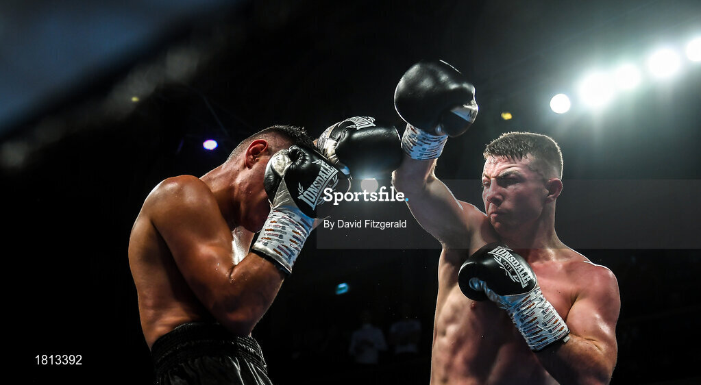11 October 2019; Pierce O'Leary, right, in action against Oscar Amador during their super lightweight bout at the MTK Fight Night in the Ulster Hall, Belfast. Photo by David Fitzgerald/Sportsfile