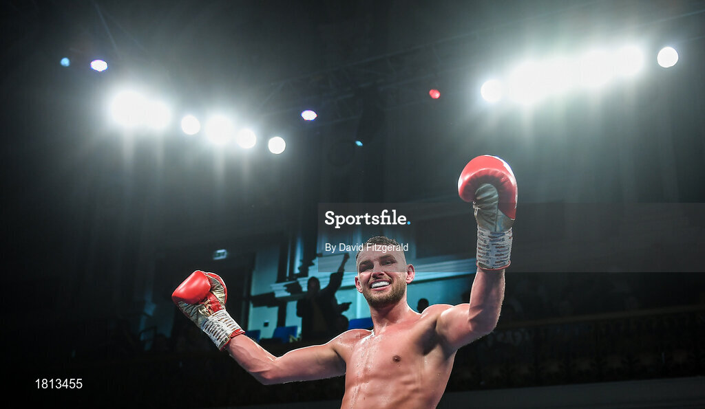 11 October 2019; Sean McComb celebrates after defeating Emiliano Dominguez Rodriguez in their super lightweight bout at the MTK Fight Night in the Ulster Hall, Belfast. Photo by David Fitzgerald/Sportsfile