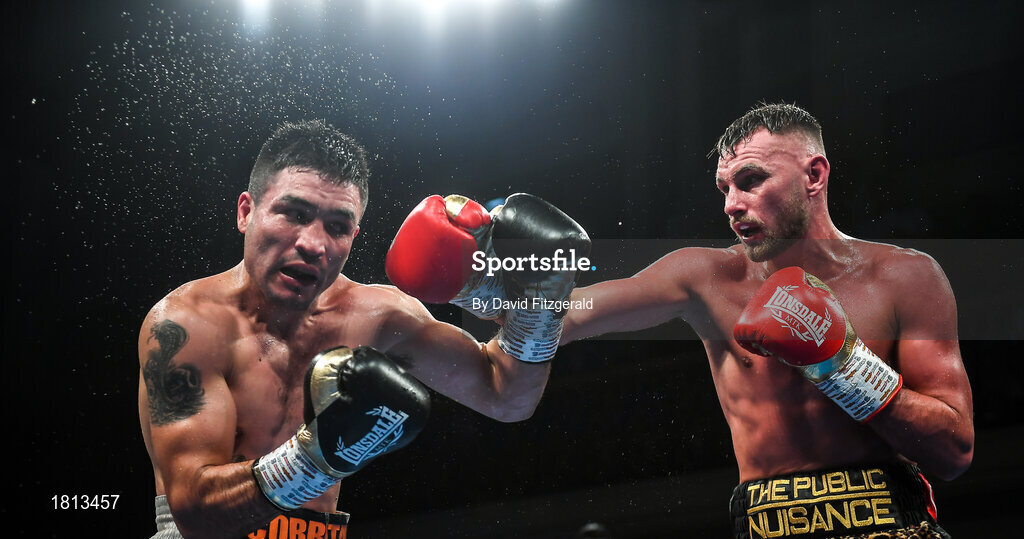 11 October 2019; Sean McComb, right, in action against Emiliano Dominguez Rodriguez during their super lightweight bout at the MTK Fight Night in the Ulster Hall, Belfast. Photo by David Fitzgerald/Sportsfile