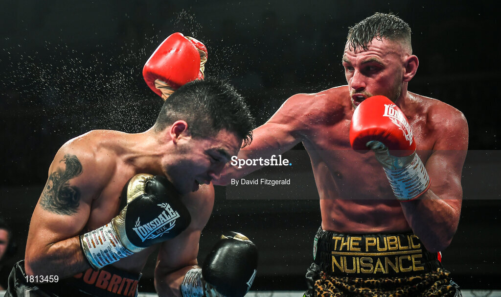 11 October 2019; Sean McComb, right, in action against Emiliano Dominguez Rodriguez during their super lightweight bout at the MTK Fight Night in the Ulster Hall, Belfast. Photo by David Fitzgerald/Sportsfile