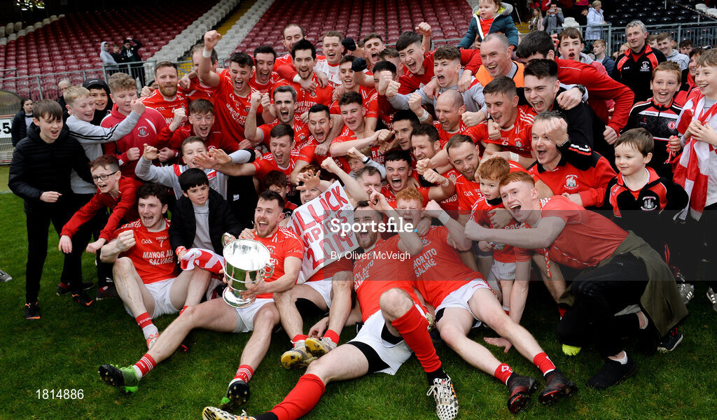13 October 2019; Trillick players celebrate with the O'Neill Cup after the Tyrone County Senior Club Football Championship Final match between Errigal Ciaran and Trillick at Healy Park in Omagh, Tyrone. Photo by Oliver McVeigh/Sportsfile