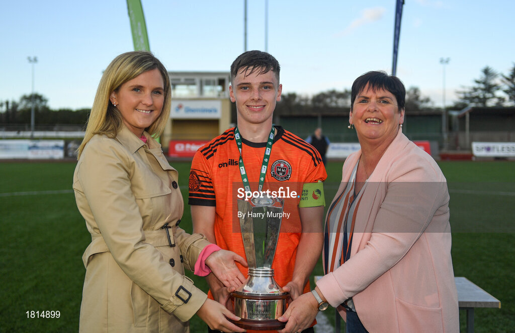 13 October 2019; Sean McManus of Bohemians is presented the Mark Farren Cup by Leanna Sheill of SSE Airtricity and Brigit Flannery, sister of Mark Farren, following the SSE Airtricity League - U17 Mark Farren Cup Final match between Kerry and Bohemians at Mounthawk Park in Tralee, Kerry. Photo by Harry Murphy/Sportsfile